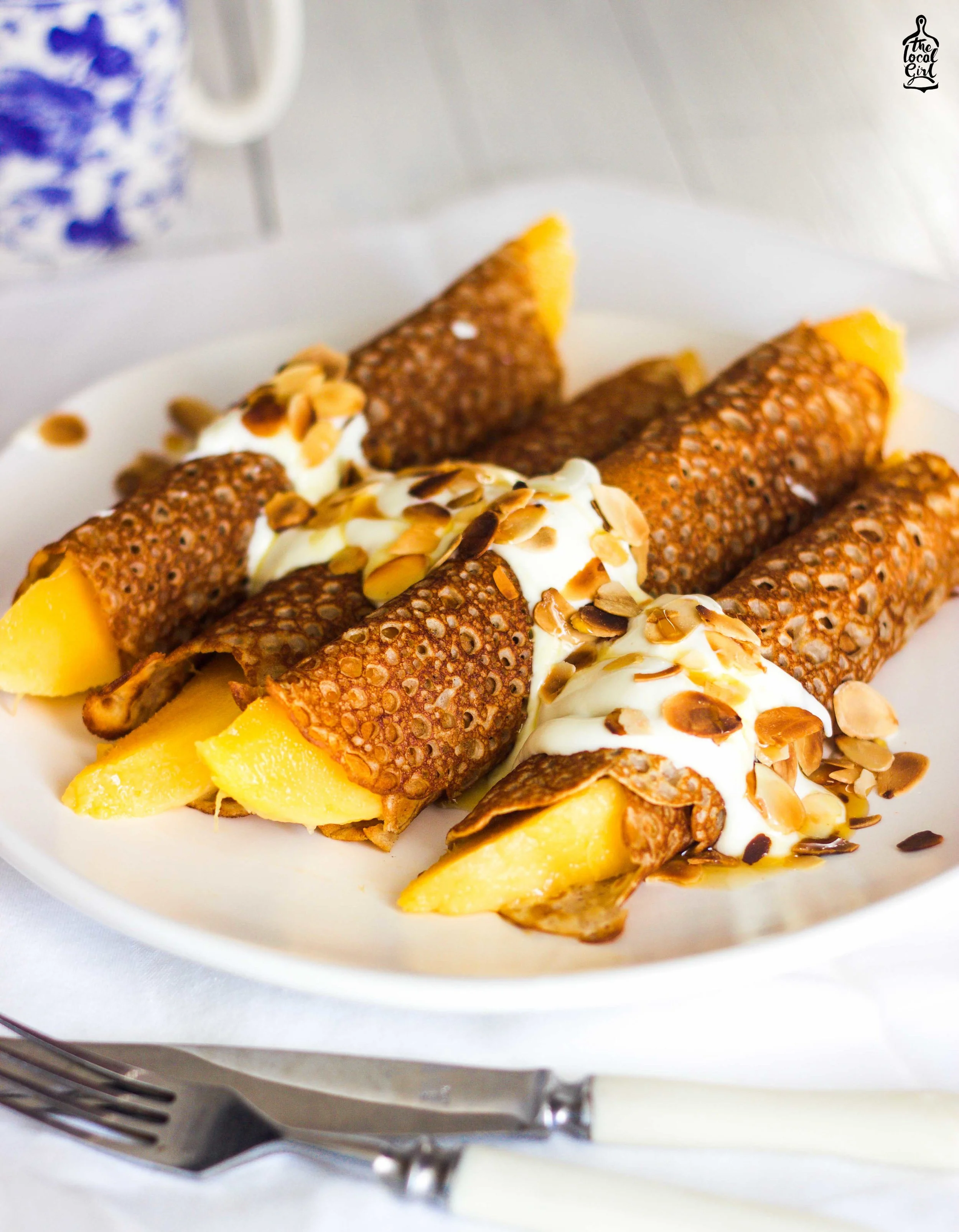 5. To serve, place 2 pieces of mango in one crepe and roll it up. Repeat and top both crepes with 1 big dollop of yoghurt, a tbsp. of toasted almond flakes and maple syrup. Dig in!